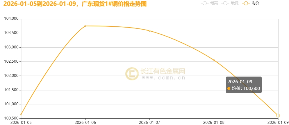 1月9日当周,国内现货铜价高位跳水。长江有色金属网数据显示,长江现货1#铜均价报102310元/吨,日均上涨252元/吨;环比上周均价99506.67元/吨上涨2.82%。广东现货1#铜均价报102224元/吨,日均上涨262元/吨,环比上周均价99390元/吨上涨2.85%。