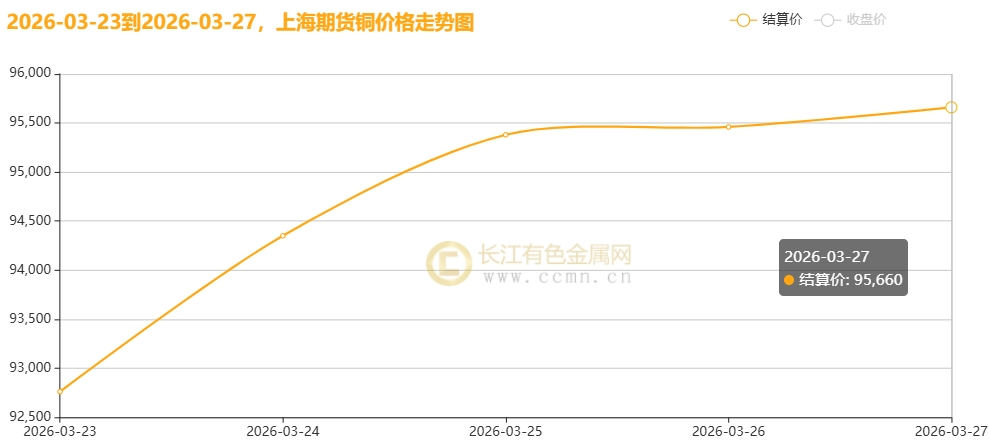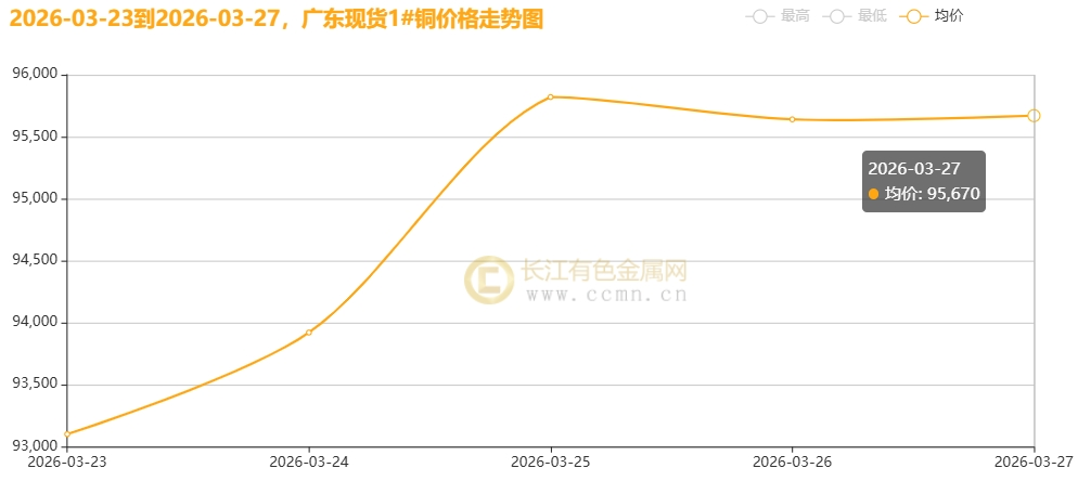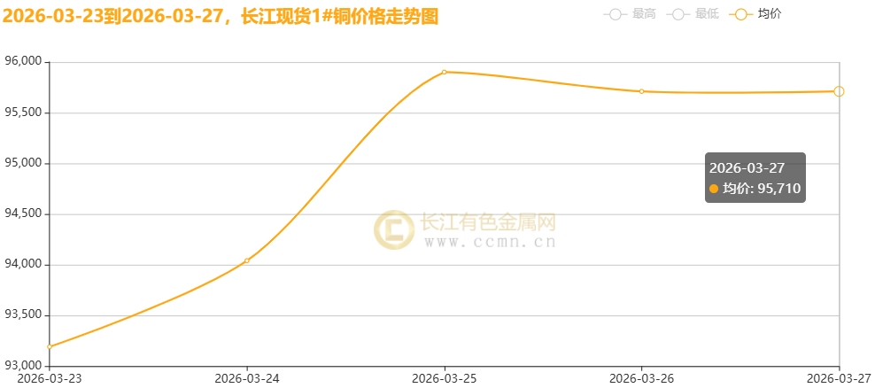 3月27日当周,国内现货铜价先抑后扬。长江有色金属网数据显示,长江现货1#铜均价报94910元/吨,日均下跌36元/吨;环比3月20日当周均价98142元/吨下跌3.29%。广东现货1#铜均价报94830元/吨,日均下跌28元/吨,环比3月20日当周均价98042元/吨下跌3.28%。