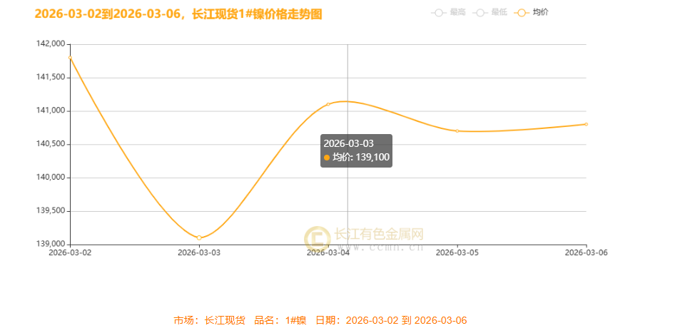 本周(3月2日至6日)长江现货1#镍价呈现典型的“V型反转”走势,先大幅下探后强势反弹,随后转入高位震荡整理。全周均价累计下跌600元/吨至周度总均价报140,700元/吨,价格在135,600至145,500元/吨宽幅波动,振幅显著。具体而言,周初价格从141,800元/吨下挫,3日跌至周内低点139,100元/吨;4日强势反弹2000元至141,100元/吨,快速修复失地;周五在140,700-140,800元/吨窄幅整理,多空力量趋于平衡。市场波动剧烈,显示139,000元/吨附近支撑强劲,但反弹后动能趋缓,表明价格在重新评估中寻找新的供需平衡点。
