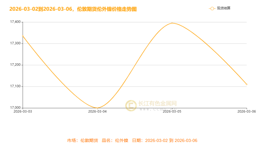 2026 年 3 月 2 日至 6 日,伦镍呈现 “先抑后扬再回落” 的 V 型震荡走势,全周围绕 17,000-17,500 美元 / 吨区间博弈。周初受美元走强、美股波动拖累,伦镍单日重挫约 3%,下探至 17,000 美元 / 吨附近后,借中东局势升级带来的成本支撑展开反弹,冲高至 17,665 美元 / 吨后,又因基本面宽松格局承压回落,最终收于 17,150 美元 / 吨附近。