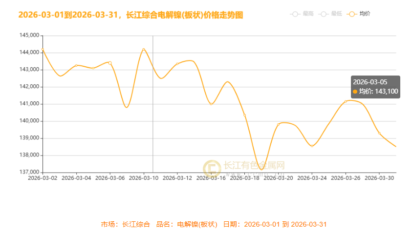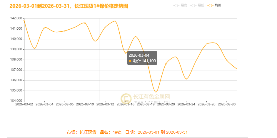 影响本月镍价走势的主要因素回顾:2026年3月,长江现货市场1#镍价整体呈现“先冲高,后下探,再反弹”的过山车行情。月初价格自月内高点141,800元/吨(3月2日)快速回落,上旬出现单日超-2,700元/吨的剧烈下跌。中旬价格虽两度尝试反弹,但均价始终未能有效突破141,000元/吨的阻力位,反弹力度明显不足。进入下旬,市场转入137,000–139,500元/吨的区间弱势盘整,并最终收于月内低位137,100元/吨,全月累计下跌约3.3%。从关键数据看,本月月度总均价为139,313.64元/吨,环比下跌,整体较2月下跌304.55元,反映出多空博弈激烈、市场情绪分化的特征。下方135,000元/吨附近成为多次测试的关键支撑,而上方141,000–142,000元/吨则构成明确的压力区间。