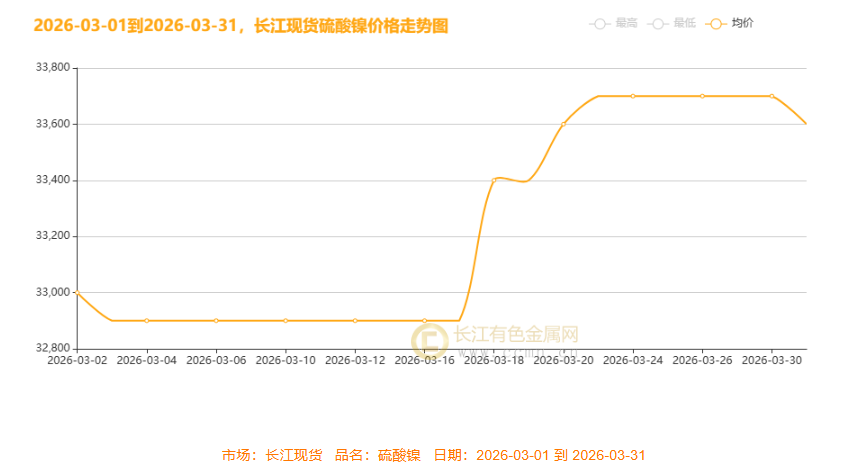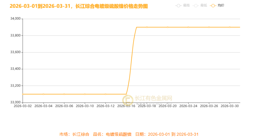 2026 年 3 月长江现货电镀级硫酸镍价格呈 “先稳后涨、高位持稳” 运行态势。3 月上旬至 3 月 16 日,市场均价稳定在 33100 元 / 吨;3 月 17 日价格单日大涨 800 元 / 吨,此后维持 33900 元 / 吨高位盘整,全月均价 33500 元 / 吨。核心驱动因素:“金三银四” 开工季,新能源电池、电镀行业需求回暖,叠加原料镍价支撑、市场供应偏紧,推动价格跳涨后企稳,行业景气度回升带动市场情绪持续向好。