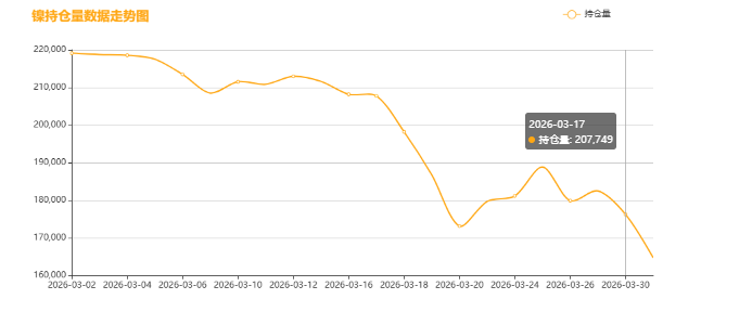 2026 年 3 月镍期货持仓量全月呈下行趋势。月初维持 21万手附近高位震荡,中旬起大幅回落,3 月 17 日降至 207749 手,下旬探底后小幅反弹,月末再度加速下行,全月持仓量显著缩水。核心驱动因素:现货硫酸镍价格跳涨后,期货端资金获利了结离场;叠加 “金三银四” 开工季产业套保调整、市场对镍价后市分歧加大,资金持续撤离,推动持仓量持续走弱。