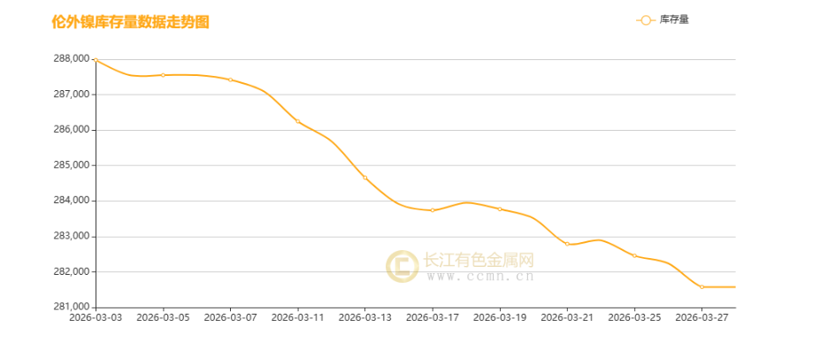 2026 年 3 月伦镍库存呈持续下行趋势。月初库存约 28.8 万吨,全月呈现小幅去库化,至 3 月 27 日降至 28.15 万吨附近,核心影响因素:一是印尼镍矿配额审批不及预期,叠加中东硫磺供应中断引发原料供给担忧,市场去库情绪升温;二是国内 “金三银四” 开工季下游补库需求释放,带动伦镍库存持续去化;此外,伦镍价格偏强运行也一定程度抑制了现货进口流入,进一步推动库存走低。