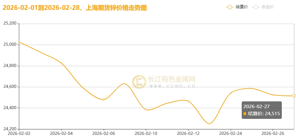 "山雨欲来风满楼",二月锌市恰似这诗中景象——高位遇阻的走势、供强需弱的困局、地缘硝烟的阴影,共同织就一张价格承压的网。2月沪期锌月均价报24586.36元/吨,周线收跌4.83%,日均下跌166.43元/吨;据长江有色金属网最新数据,2月0#锌价从24990元/吨跌至24480元/吨,跌幅2.04%,1#锌价亦同步下滑,价格重心较1月明显下移,恰似"春寒料峭透帘栊",寒意浸骨。
