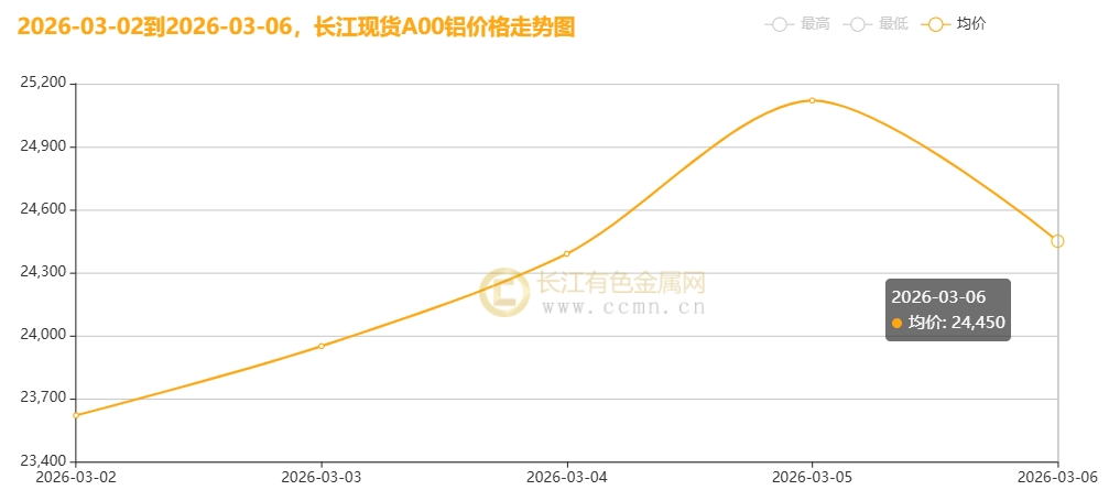 CCMN数据显示,长江现货A00铝周均价24306元/吨,日均上涨208元/吨;环比2月27日当周均价23425元/吨上涨3.76%。