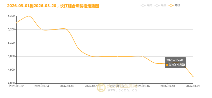 进入2026年3月,原本备受市场关注的稀有金属铟,彻底告别前期强势上涨行情,步入震荡下行通道。长江有色金属网数据显示,3月20日,长江综合铟均价报4850元/千克,较上一交易日单日回落100元,跌势进一步延续;而纵观整月走势,铟价从3月初5300元/千克的高位一路下滑,截至目前累计下跌450元,跌幅接近8%。