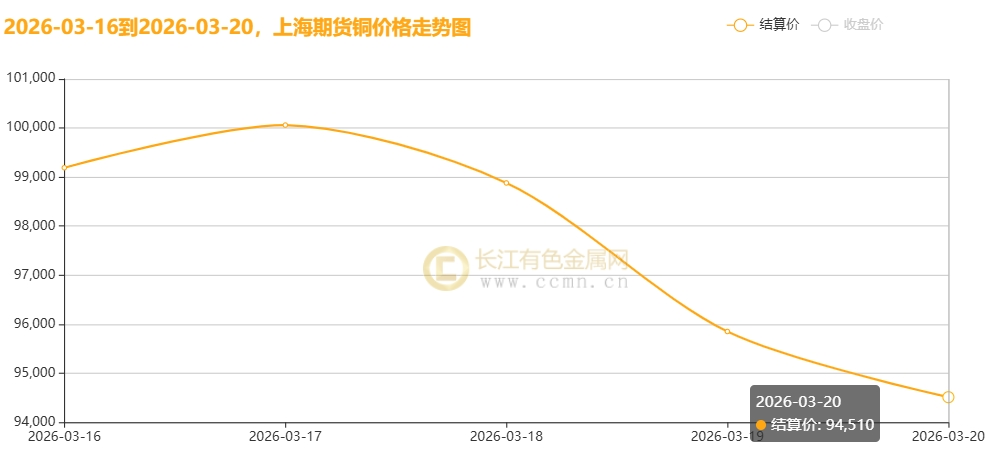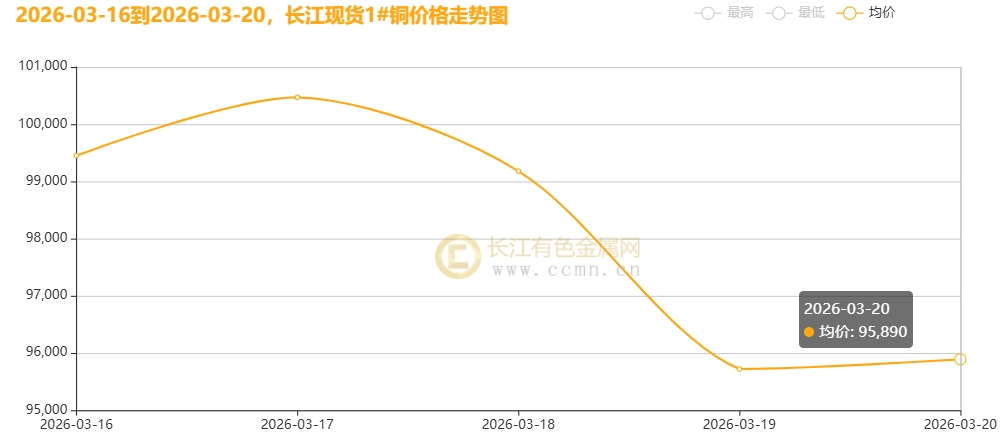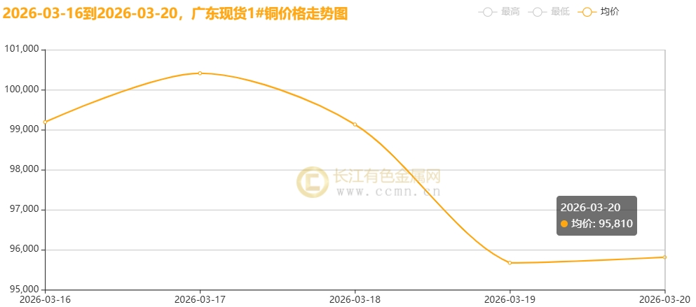 3月20日当周,国内现货铜价高位重挫。长江有色金属网数据显示,长江现货1#铜均价报98142元/吨,日均下跌960元/吨;环比3月13日当周均价101032元/吨下跌2.86%。广东现货1#铜均价报98042元/吨,日均下跌954元/吨,环比3月13日当周均价100940元/吨下跌2.87%。