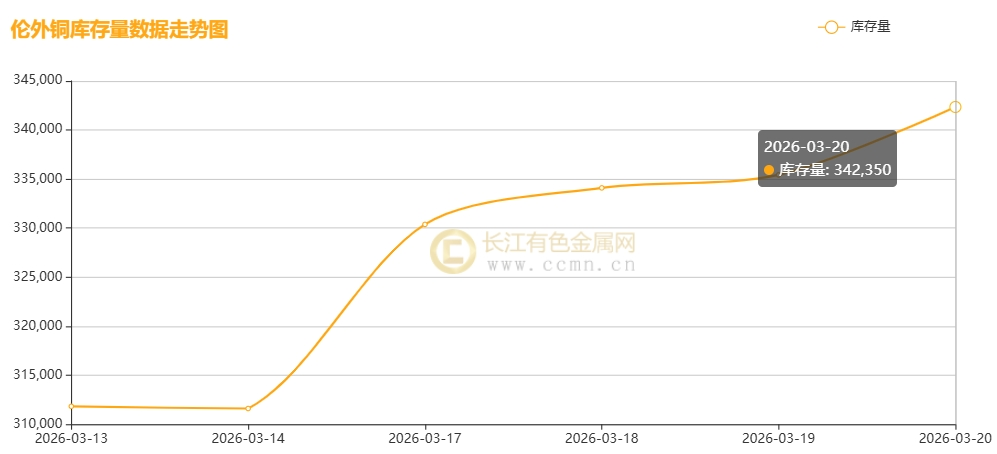 如上图所示,伦铜库存继续保持累积姿态,较上周增加30,525吨至342,350吨,环比涨幅9.79%,创下2019年8月以来新高。