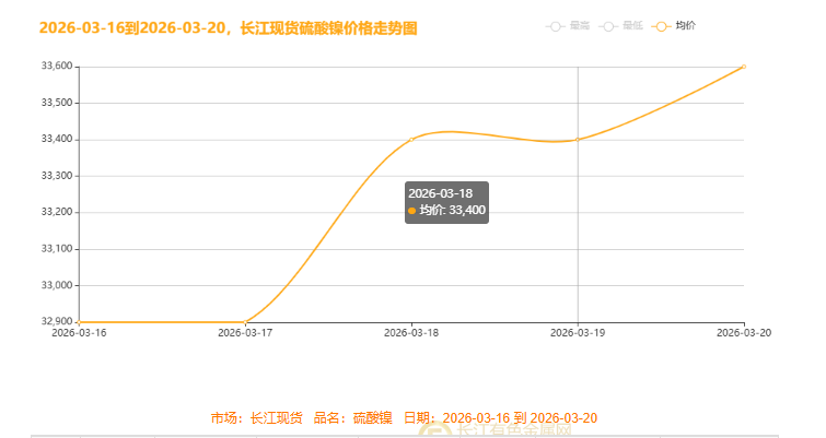 长江现货硫酸镍价格先稳后涨:16-17 日均价持稳 32900 元,18 日跳涨至 33400 元,19 日微幅回调后 20 日续冲至 33600 元,整体呈强势上行态势。核心驱动因素为新能源电池需求回暖、原料供应偏紧及市场情绪乐观。