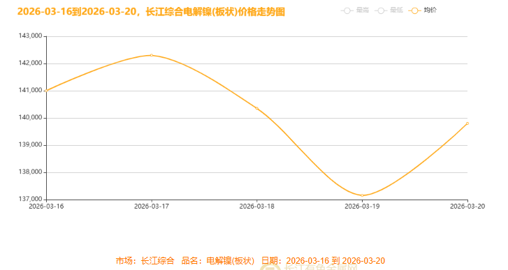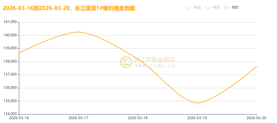 2026 年 3 月 16 日 - 20 日,长江现货市场 1# 镍走出冲高回落、探底反弹的剧烈 V 形震荡,全周价格重心较上周下移。周初镍价高位运行,17 日触及周内最高价 143650 元 / 吨;随后两日连续大跌,19 日跌至低点 131650 元 / 吨,高点回落超 5000 元。20 日现货镍强势反弹,单日上涨 2750 元 / 吨,全周总均价报137910元/吨,较前一周价格下跌830元,135000 元 / 吨下方显现强支撑,多空博弈白热化。