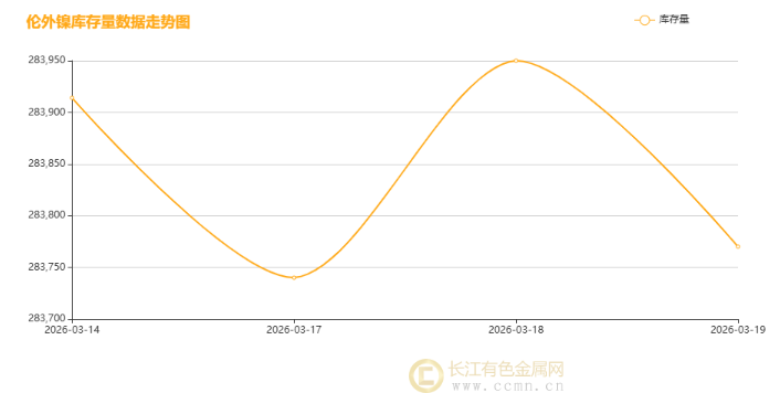 2026 年 3 月 14-19 日伦镍库存呈先降后升再回落的窄幅波动走势,17 日触底约 283740 吨,18 日冲高至约 283950 吨,整体维持在 283740-283950 吨区间。波动核心源于 LME 交割节奏、仓单流转及下游需求阶段性变化:交割期库存阶段性流出致去库,随后补库或仓单集中入库推升库存,后续需求疲软与出库流出又使库存回落,反映短期供需与市场情绪的博弈。