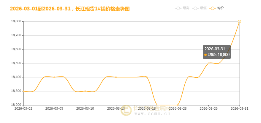 3月收官之日,镁价延续上行态势,为整个3月的稳健走势画上圆满句号。据长江有色金属网数据显示,2026年3月31日长江现货1#镁均价报18800元/吨,较上一交易日上涨200元;回顾整个3月,镁价呈现“稳中有升”的清晰走势,从月初18300元/吨起步,逐步攀升至月末的18800元/吨,累计上涨500元/吨,涨幅约2.73%。本轮镁价稳步上行是成本托底、供需紧平衡、需求爆发及行业龙头引领等多重因素共振的结果,结合当前行业动态,后市走势值得关注。