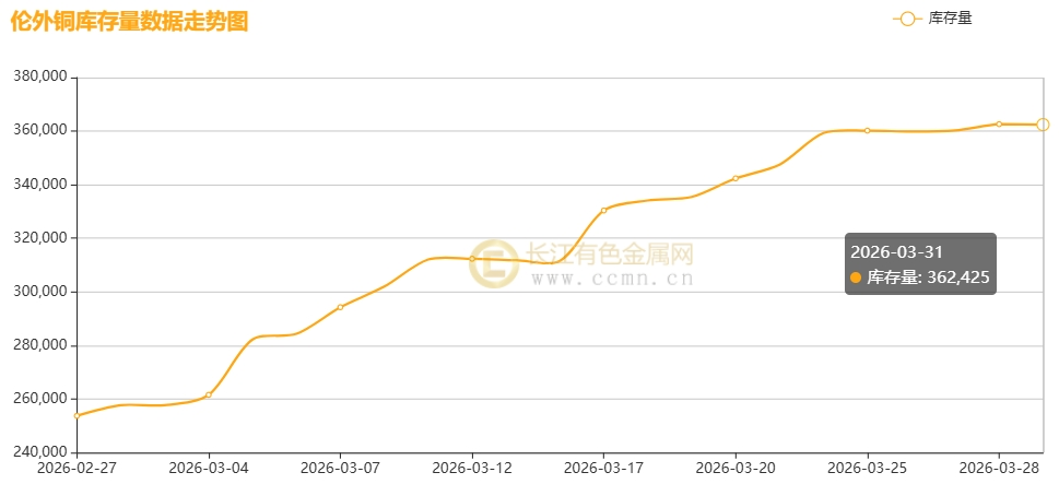 如上图所示,2026年3月LME铜库存呈大幅累积态势;月度库存增加108,725公吨至362,425公吨,环比2026年2月(253,700吨)上涨42.86%;同比2025年3月库存水平(211,375吨)上涨71.46%;刷新自2018年4月12日以来新高,反映当前库存水平处在历史绝对值高位,对铜价构成明显的拖累。