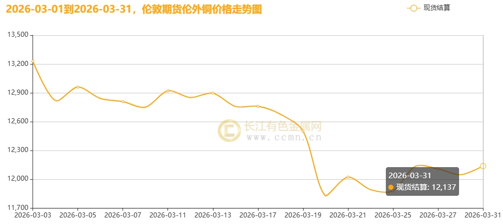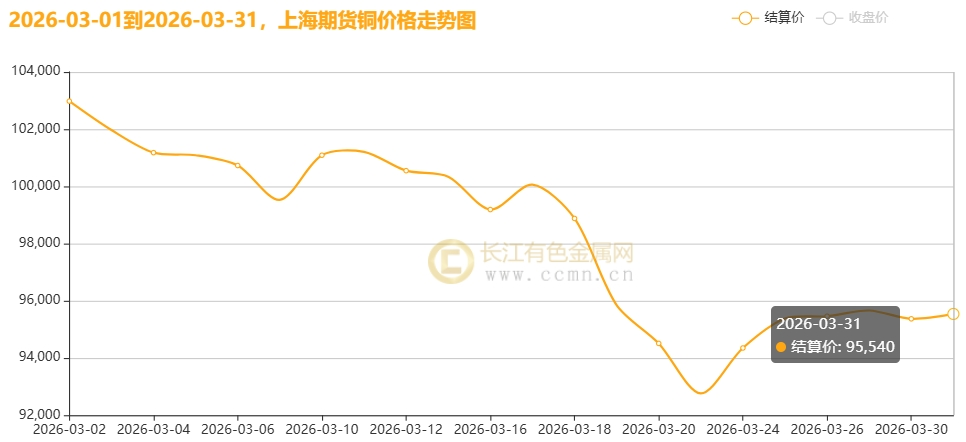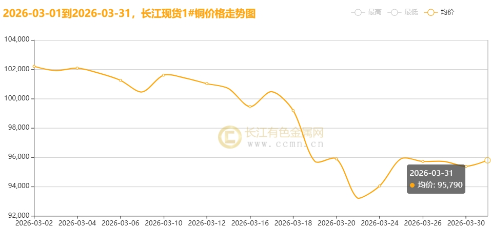 如上图所示,2026年3月,国内现货铜价呈现高位宽幅震荡行情,价格中枢下移明显。长江有色金属网——长江现货1#铜月均价报98671.36元/吨,日均下跌294.55元/吨,环比2026年2月均价(101810元)下跌3.08%;同比2025年3月均价(79810)上涨23.63%。