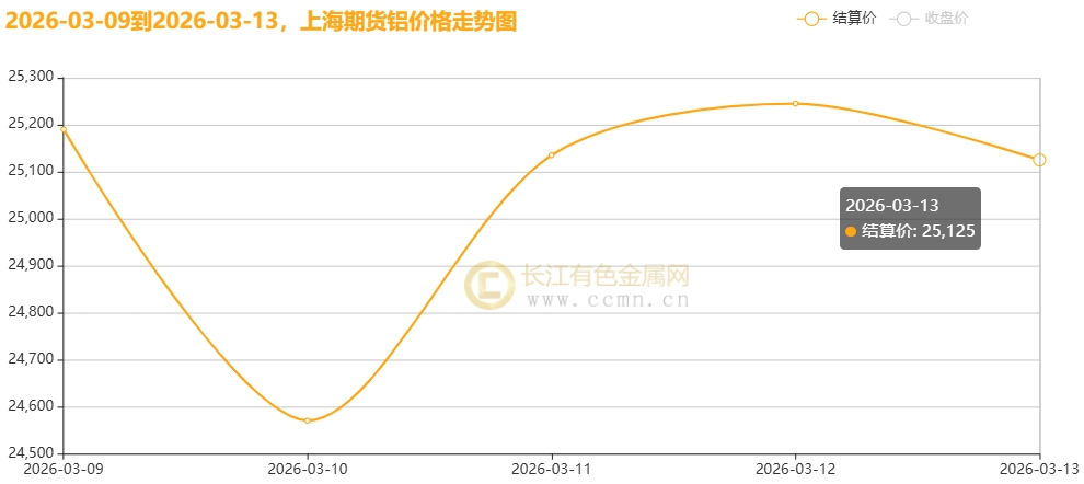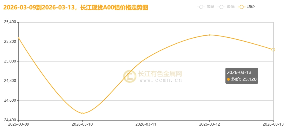 3月13日当周,国内现货铝锭触底反弹后高位修整。长江有色金属网数据显示,长江现货A00均价报25026元/吨,日均上涨134元/吨;环比3月6日当周均价24306元/吨上涨2.96%。