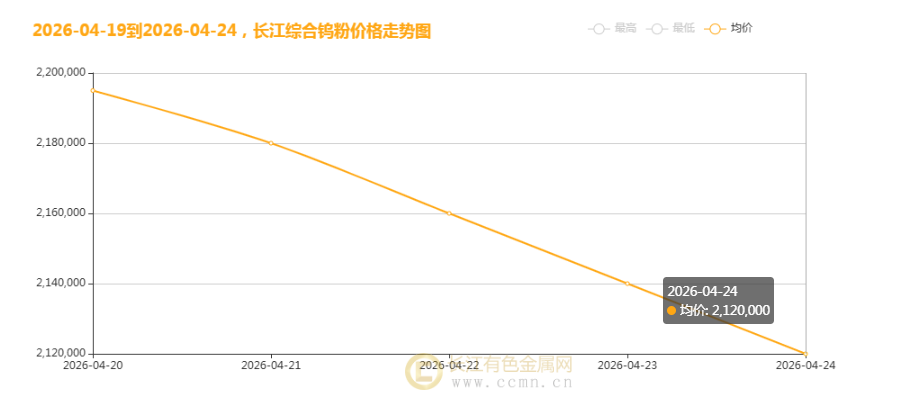 据长江有色金属网数据,2026 年 4 月 24 日,长江综合钨粉均价报 2120000 元 / 吨,较上一交易日下跌 20000 元;本周累计下跌 75000 元,自 4 月初以来已进入持续回调通道,市场情绪转向谨慎,高位抛压集中释放,下游刚需采购为主,供需呈现 “供增需弱” 短期格局。此番下跌是前期暴涨后技术性修正、下游成本压力下采购保守、废钨市场拖累及龙头报价下调等多重因素叠加的结果,短期回调压力仍未释放完毕。