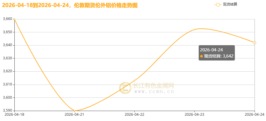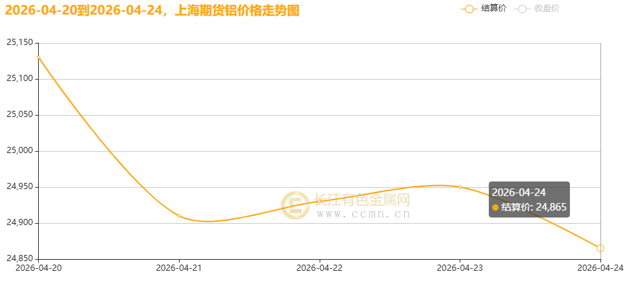 4月24日当周,国内现货铝锭价格高位回落。长江有色金属网数据显示,长江现货A00均价报24776元/吨,日均下跌82元/吨;环比4月17日当周均价24842元/吨下跌0.27%。