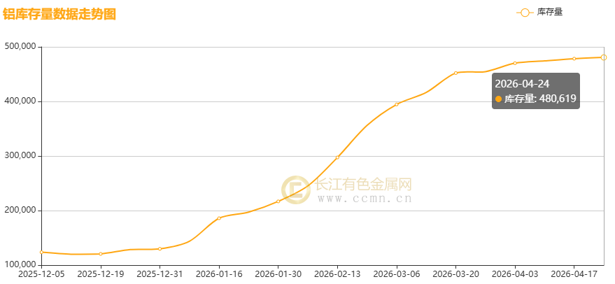 CCMN数据显示,沪铝社会库存连续18周累积;截至当周(4月24日)增加2,265吨至480,619吨,环比上周涨0.47%,刷新自2020年4月17日(485,802吨)以来新高,对铝价构成较强的上行压力。