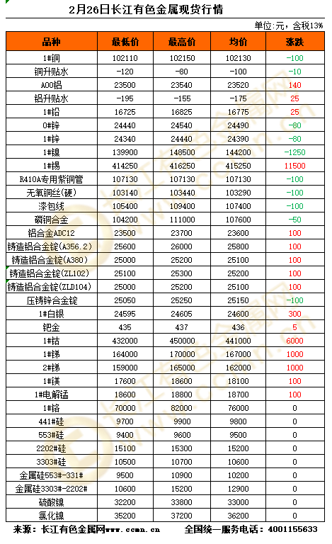 2月26日长江有色金属现货行情