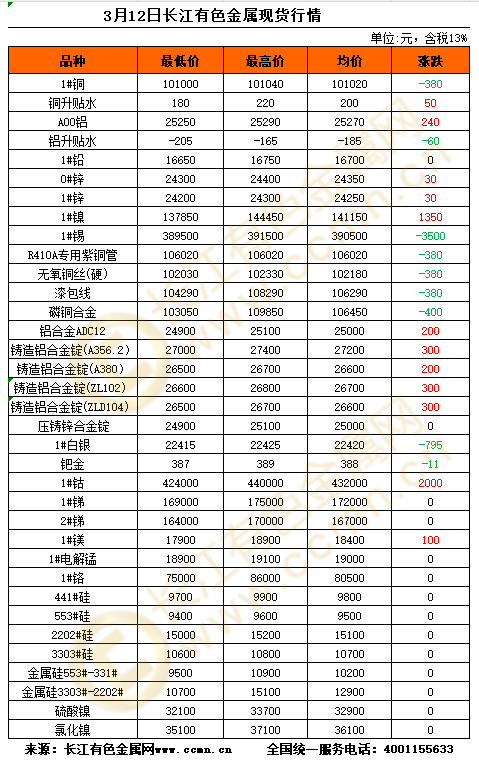 当前位置: 长江有色金属网 > 资讯首页 > 行业要闻 > 3月12日长江有色金属现货行情
