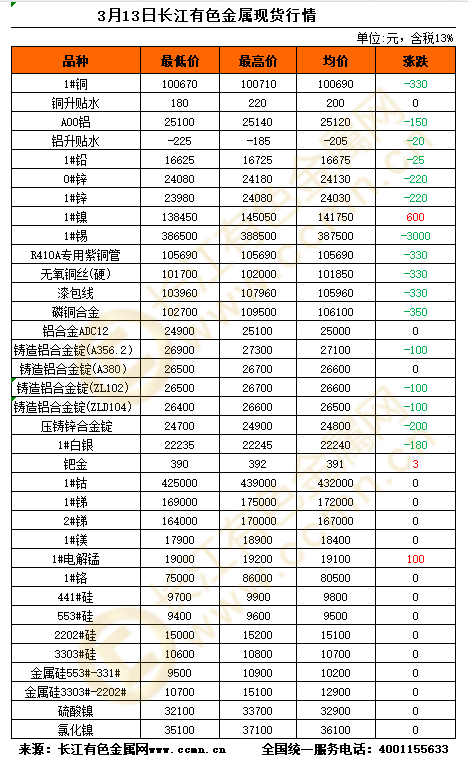 当前位置: 长江有色金属网 > 资讯首页 > 行业要闻 > 3月13日长江有色金属现货行情