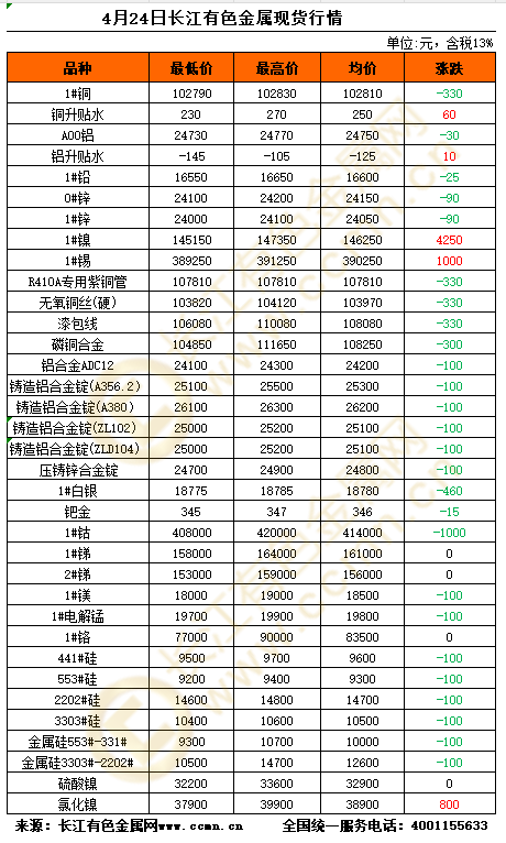 当前位置: 长江有色金属网 > 资讯首页 > 行业要闻 > 4月24日长江有色金属现货行情