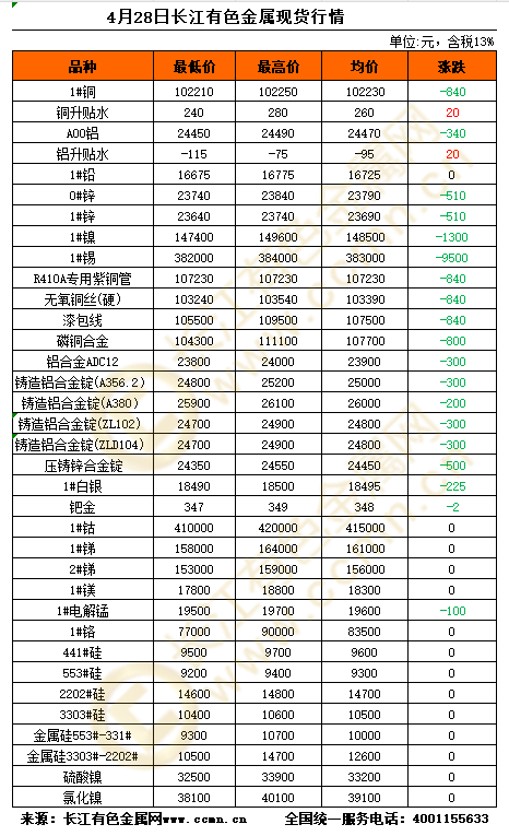 长江有色金属网 > 资讯首页 > 行业要闻 > 4月28日长江有色金属现货行情